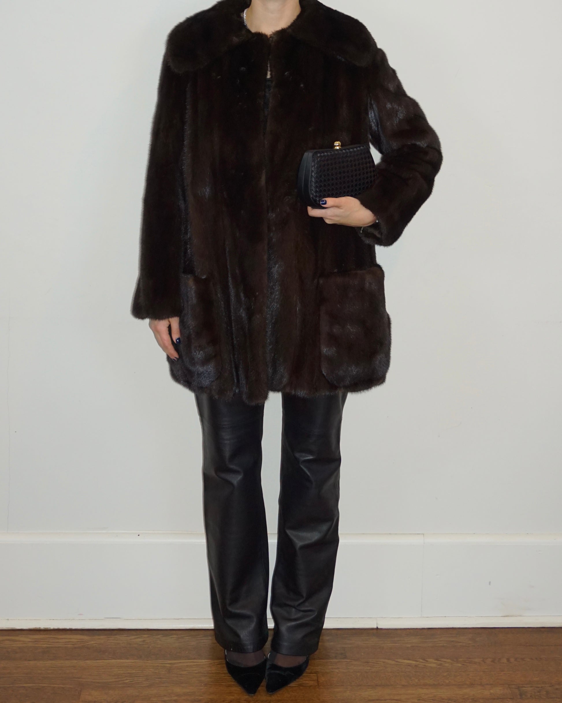 Elegant brown mink coat featuring a chic collar, large pocket detailing, and secure clasp closures.
