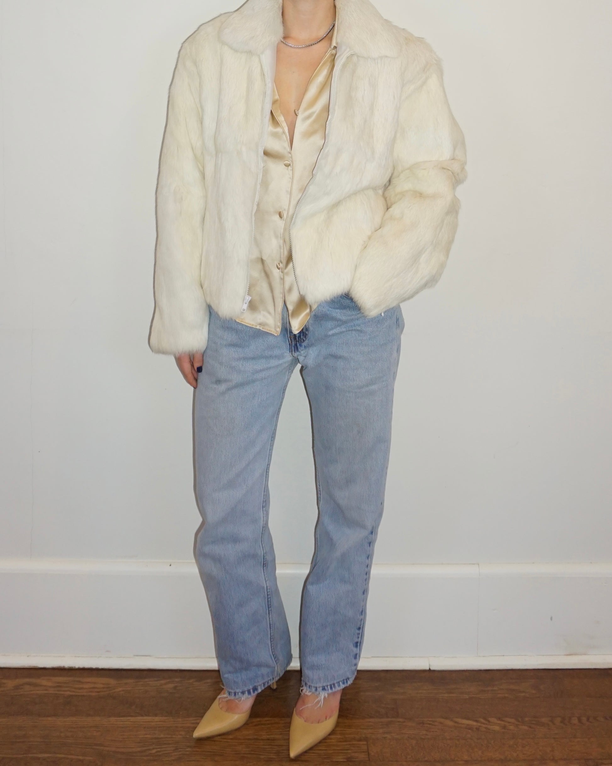 Soft white rabbit fur coat featuring a front zipper closure and side pockets.