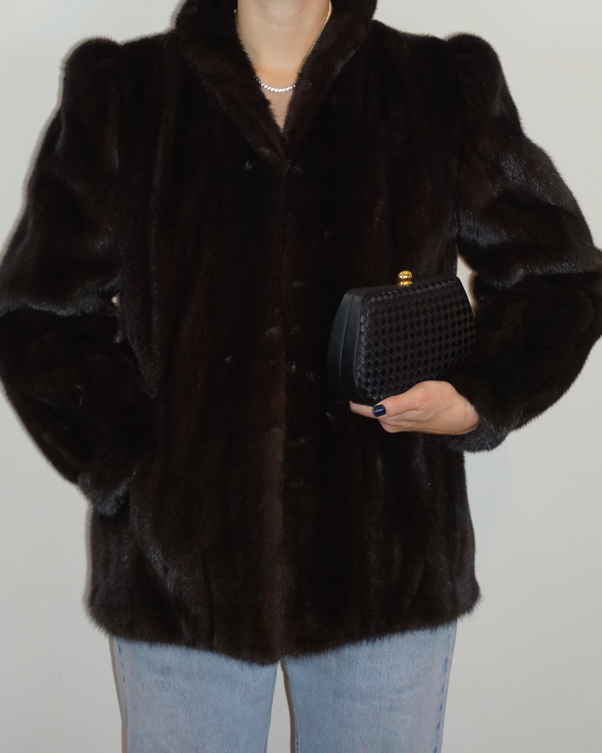 Elegant brown mink fur coat featuring structured shoulders, pockets, and classic clasp closures.