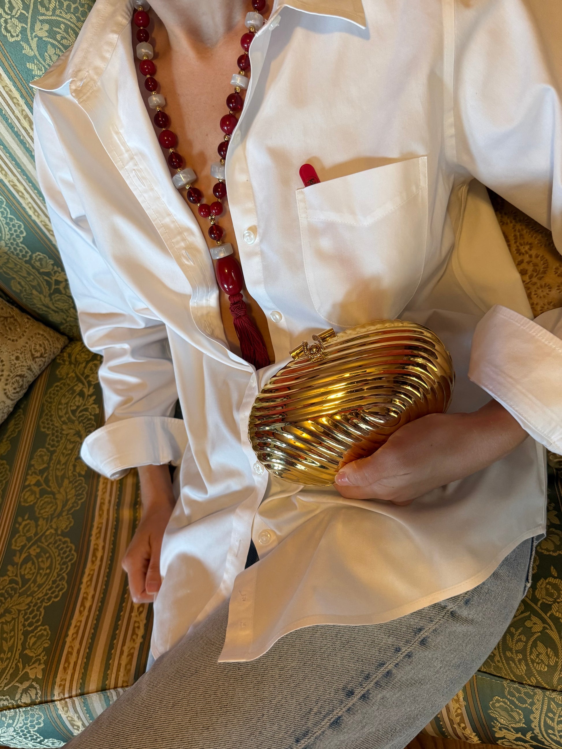 Sculptural metal purse in a polished shell silhouette with optional chain strap and velvet interior lining